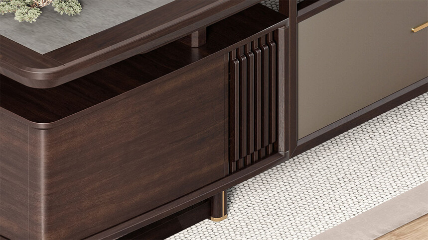鸿泰系列是一款新中式风格的办公家具,设计灵感源于中式传统装饰纹样“回”字形,因其形式回环反复,延绵不断,在民间有“富贵不断头”的说法,有连绵不断、吉利长久的吉祥寓意,在造型上主要采用硬朗简洁的直线条,温润的乌金木与质朴的岩板相结合,刚柔并济,时尚大方,既使得中式家具古典、质朴的内涵显现,又符合现代办公追求的时尚感、实用性。