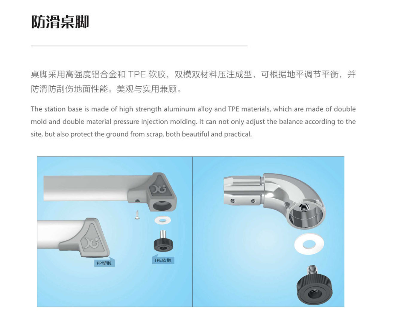 5.桌脚掌:1.8mm壁厚,脚套底有4个平衡脚套。